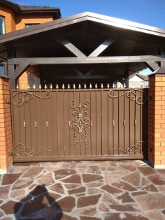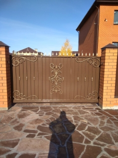 Покупала кованых констуркций распашного типа порадовала. Одни потребовались под навес. Производитель изделий и электропривода компания Дорхан. Полотно выглядит стильно, впереди кованный орнамент, сзади сделали стальной лист. Нравится система дистанционного управления, весьма удобная и экономит время.